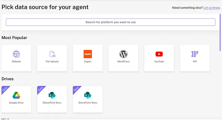 You can pick your data source to be your website, text files, documents, Zapier, WordPress site, YouTube channels, and more.