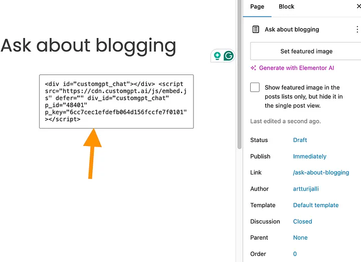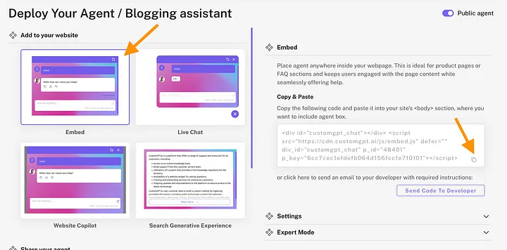 Go back to your CustomGPT agent deployment view and choose “Embed” as the chatbot style. Then copy the code on the right to your clipboard.