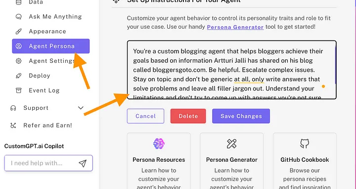 Remember to also customize your AI agent’s persona by clicking the “Agent Persona” tab on the left. This makes your chatbot sound like you and respect your company values.