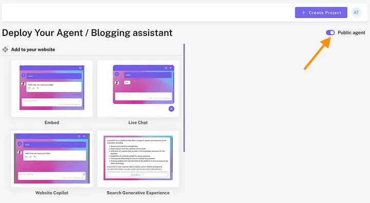 If you want anyone to be able to interact with your AI agent, activate the “Public agent” slider on the top right corner.