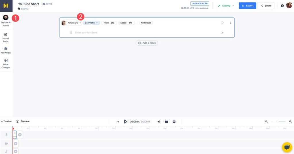 On the next screen, you’ll complete a series of steps to create your video. First, you’ll need to select an AI voice for your video. For this tutorial, we’re using the free version of Murf AI, which gives us over 30 voices to choose from. Go ahead and click on Explore AI Voices (1), or click the dropdown (2) at the top of the text field.