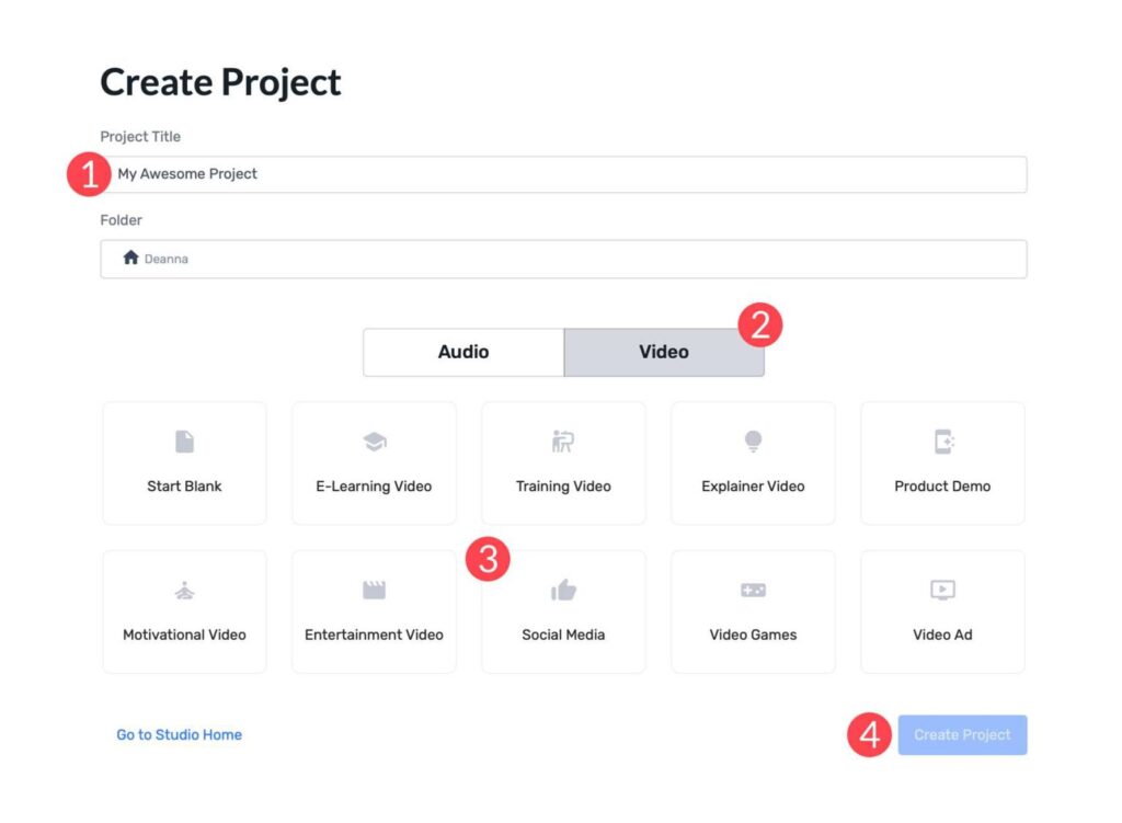 Next, give your project a name (1), select the video tab (2), choose social media as the format (3), and click the Create Project button (4).