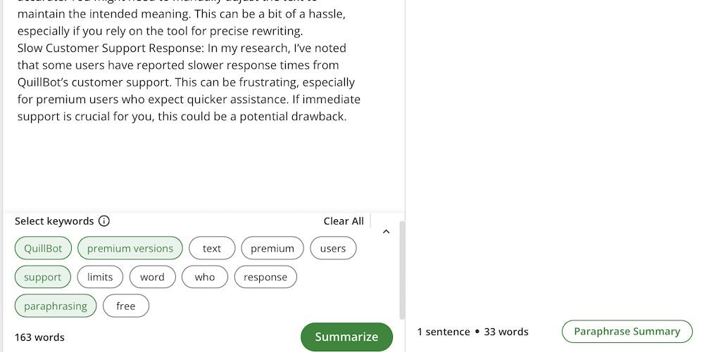 - Word limits in both free and premium plans: QuillBot imposes word limits on both free and premium versions to some degree. This can be restrictive for users who need to process large volumes of text regularly. The premium plan allows for unlimited paraphrasing but limits plagiarism prevention to 25,000 words/month and text summarizing to 6000 words/ month. It’s something to keep in mind if you often work with lengthy documents.