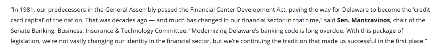 On Monday, Democratic Sen. Spiros Mantzavinos and Representative Bill Bush filed a pair of bills — Senate Bill 16 and Senate Bill 19 — designed to bring Delaware’s banking laws into the modern era.